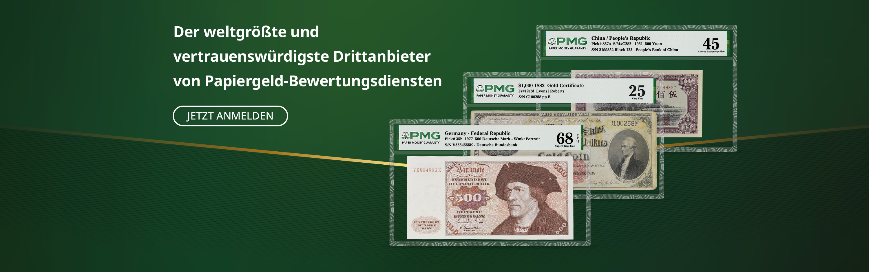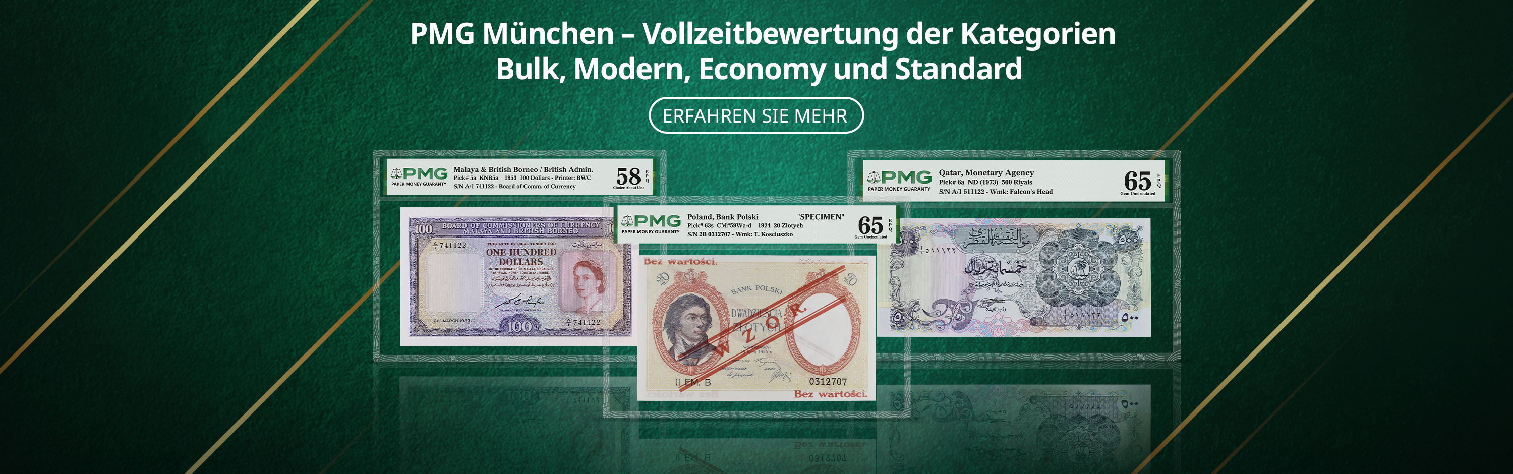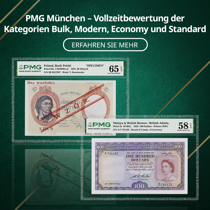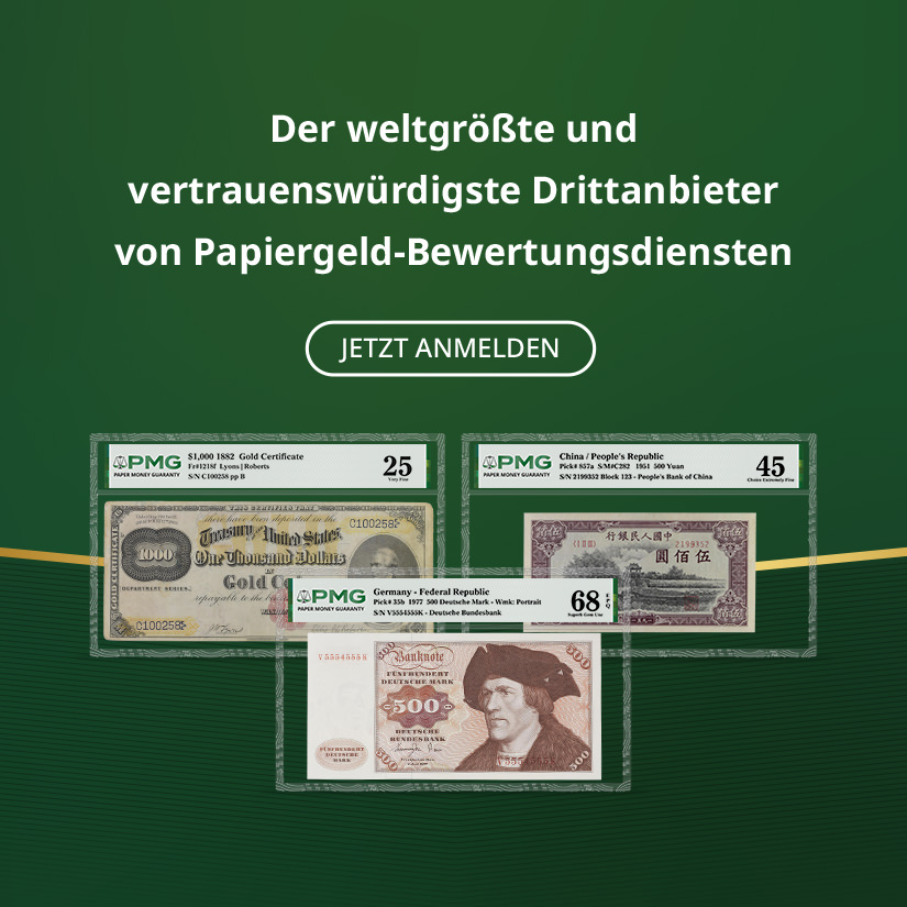 Für Sammler von Banknoten bietet PMG eine genaue, konsistente und unparteiische Bewertung der Echtheit und des Erhaltungszustands, unterstützt durch die umfassende PMG-Garantie, die Käufer und Verkäufer schützt. PMG ist Teil der Certified Collectibles Group, die es sich zur Aufgabe gemacht hat, Sammler mit Dienstleistungen zu unterstützen, die ihre Leidenschaft entfachen, Werte schaffen und eine Gemeinschaft aufbauen.