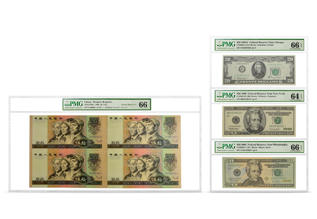 Darüber hinaus können Sie PMG-Standardfassungen zur Archivierung spezieller Präsentationen einzelner Banknoten verwenden, wodurch Sie die Flexibilität haben, Banknoten verschiedener Themen, Nennwerte und Epochen in einer schützenden Fassung zu kombinieren. Bitte beachten Sie, dass die Entscheidung über die Einfassung in PMG-Standardfassungen ausschließlich im Ermessen von PMG liegt.